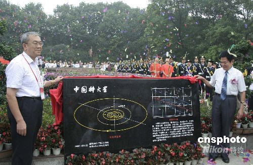 9月20日,在中國科技大學東區郭沫若廣場上隆重舉行科大五十年校慶日升旗暨“中國科大星”紀念碑揭幕儀式,為學校五十華誕獻上第一份祝福。2007年元月,國家天文臺研究決定,選定編號為19298這顆于1996年9月20日即科大校慶日發現的小行星命名為“中國科大星”。之前,內地以高等學校名稱命名的小行星只有4顆,分別是“北京大學星”、“南京大學星”、“北京師范大學星”和“山東大學星”。圖為中科院黨組成員、校黨委書記郭傳杰(左)和龔惠興院士(右)共同為“中國科大星”紀念碑揭幕。中新社發 張婭子 攝