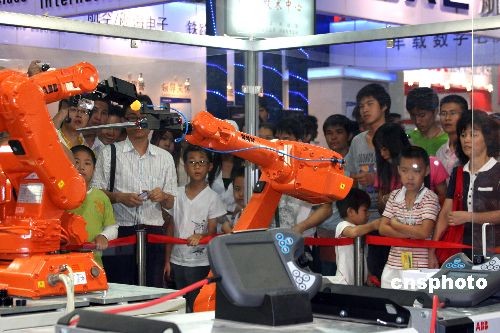 第十屆中國國際高新技術成果交易會10月12日在深圳正式開館迎客。在上屆首次設立機器人展備受追捧的基礎上,本屆高交會機器人專展在展出規模和層次上又有提高,以工業機器人、民生機器人、特種機器人、青少年機器人等多部分展示來自兩岸三地,以及日本等國的中外著名大學、研究機構、高科技企業在該領域的成果。圖為兩臺六軸機器人在乒乓球上表演寫字“手藝”,吸引著觀眾。中新社發 凌風 攝