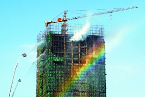 下午3時,站在該樓西南側(cè)的日新路上能看到,全樓16層至20層外圍腳手架上的綠色防塵罩已在大火中化為灰燼。盡管兩條水柱正從離地60余米高的云梯上朝著樓內(nèi)猛烈噴射,但是由于風大吹歪了水柱,高空的水霧甚至在晴空下形成了兩道彩色長虹。