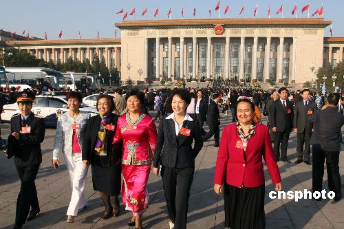 中國(guó)共產(chǎn)黨第十七次全國(guó)代表大會(huì)10月21日上午在北京人民大會(huì)堂閉幕,圖為新疆代表團(tuán)的各族代表走出會(huì)場(chǎng)。中新社發(fā) 任晨鳴 攝