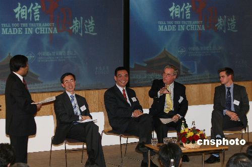 圖為英國諾丁漢大學(xué)教授姚樹潔 、中國駐英使館政治參贊劉為民、北京大學(xué)中國經(jīng)濟(jì)研究中心主任林毅夫、英中貿(mào)易協(xié)會主席白樂威和英國諾丁漢大學(xué)講師薩瑟蘭(自左至右)就“中國制造”的話題進(jìn)行討論。