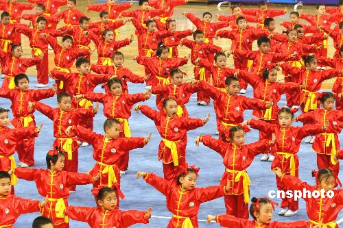 圖為在開幕式上,由百余名兒童組成的表演隊為在場觀眾奉獻精彩的表演。