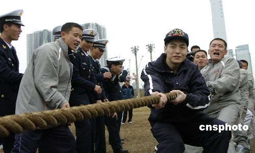 11月29日上午,正在日本進行友好訪問的中國海軍“深圳”號導彈驅逐艦上的官兵在此間與日本海上自衛隊官兵進行了體育交流。雙方隊員分成兩支混合隊伍進行足球、拔河比賽。中新社發 朱沿華 攝