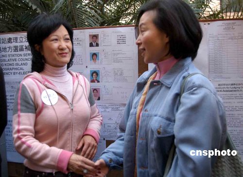 圖為葉太在票站外與信德集團董事總經理何超瓊寒暄。