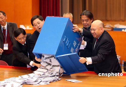 12月2日深夜,香港選管會(huì)主席彭鍵基[右]及政制及內(nèi)地事務(wù)局局長(zhǎng)林瑞麟[左二]到達(dá)票站,開啟票箱,票站內(nèi)點(diǎn)票工作隨即展開。當(dāng)日,香港立法會(huì)港島區(qū)補(bǔ)選共有八名候選人競(jìng)逐一個(gè)議席,分別是:柳玉成、李永健、蕭思江、葉劉淑儀、蔣志偉、凌尉云、陳方安生、以及何來(lái)。