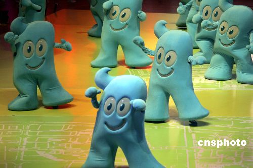 十二月十八日晚,備受海內外矚目的中國二0一0年上海世博會吉祥物在上海大舞臺揭開神秘面紗。一個返璞歸真的、漢字“人”的藍色卡通造型——吉祥物“海寶”正式亮相。“海寶”吉祥物的誕生,是海峽兩岸設計師共同的智慧結晶。其最初使用漢字充當吉祥物的創意始于臺灣知名設計師巫永堅,他的應征作品漢字卡通形象“大寶”在全球兩萬六千多件應征作品中脫穎而出,再經過上海設計名家邵隆圖及其團隊的整合、再設計,“海寶”最終定型。中新社發 潘索菲 海牛 攝