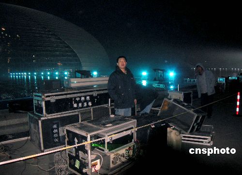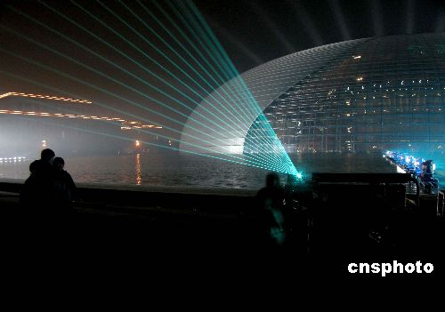 2007年12月20日晚,北京人民大會堂西側(cè),營造國家大劇院燈光效果的設(shè)施全部調(diào)試成功,大劇院被布置完畢的燈光照射出高雅的藍(lán)調(diào)色彩。12月21日國家大劇院將迎來首場演出。中新社發(fā) 博芽影像 攝