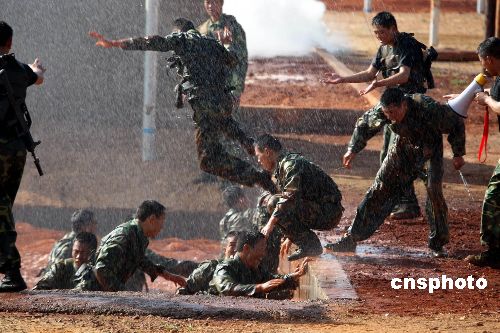 圖為中國士兵練習通過水坑。