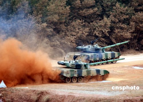 圖為訓練中,中方坦克分隊對恐怖分子實施武力打擊。