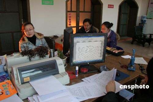12月29日,山西陽城縣民政局婚姻登記所工作人員在為準備新年結婚的青年登記忙碌。據陽城縣婚姻登記所工作人員介紹,2007年12月份結婚登記的青年不少,最多時一天有27對青年登記。中新社發 馬宏泰 攝