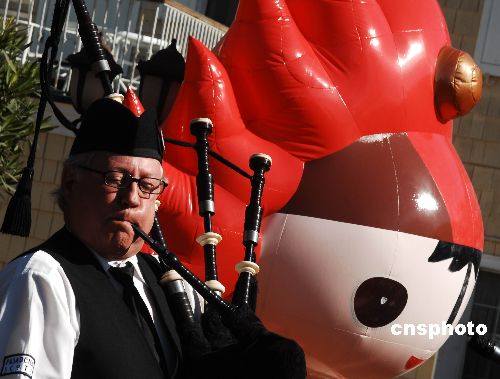 圖為中國駐洛杉磯總領事張云(左)向音樂家贈送北京奧運會吉祥物福娃。