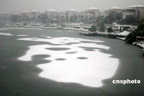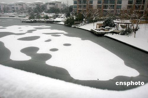 2008年1月27日,南京城南花神湖的冰面上,一幅幅圖畫般的“冰上雪”讓許多市民嘖嘖稱奇。南京連續的強降雪,給城南的花神湖披上了一件格外美麗的衣裳。中新社發 孫忠南 攝