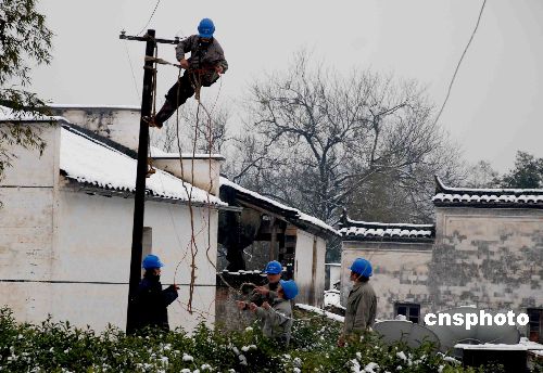 1月29日,江西婺源縣城鄉各地下起鵝毛般的大雪,造成該縣多個地方線路損壞,婺源縣供電公司成立“電力110”搶修小分隊,冒雪奔赴全縣各鄉、鎮、村進行線路維護搶修,及時恢復供電,確保了人民群眾生產生活用電。中新社發 王國紅 攝
