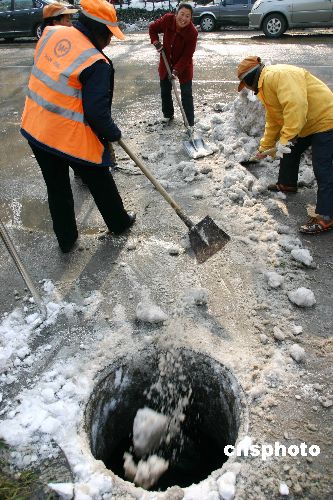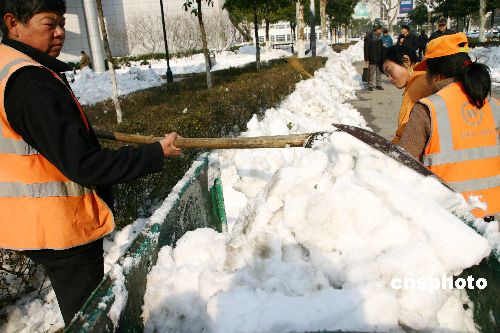 2008年1月31日,環(huán)衛(wèi)工人在南京山西路廣場(chǎng)清理積雪。南京連續(xù)兩天放睛,街頭到處可見(jiàn)掃雪人,環(huán)衛(wèi)工人運(yùn)用各種辦法掃除公路兩邊、市民廣場(chǎng)和景區(qū)內(nèi)的積雪。受連續(xù)暴雪影響,南京城內(nèi)到處是堆積如山的白雪。中新社發(fā) 阿董 攝