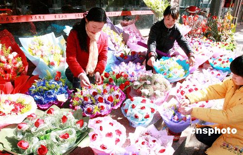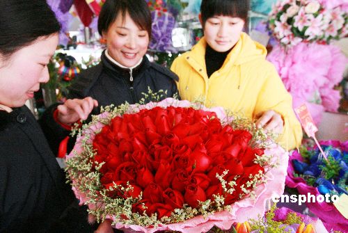 2月13日,蘇州養育巷鮮花街上一家花店員工忙碌布展。“情人節”將至,位于古城蘇州養育巷鮮花一條街上的20余家店鋪早已花團錦簇,各色玫瑰更是琳瑯滿目。據了解,不少花店早在春節前就從昆明、廣州、海南、臺灣等地及韓國、荷蘭等國訂購了大量鮮花,以備戰“情人節”市場。中新社發 蘇秀 攝