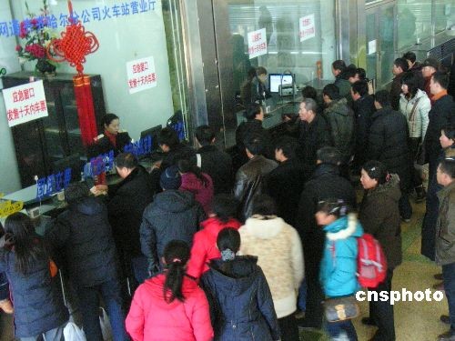 2月15日,人們在齊齊哈爾火車站售票大廳購票。當日,齊齊哈爾火車站在探親返城客流和農(nóng)民工客流出現(xiàn)高峰后,又迎來學(xué)生客流高峰,日送來往旅客達2.5萬人。為緩解購票難,車站增加了應(yīng)急售票窗口,車站派出所派出警力24小時巡查,并在廣場設(shè)置一臺報警服務(wù)車,隨時為旅客提供服務(wù)。 中新社發(fā) 王云龍 攝