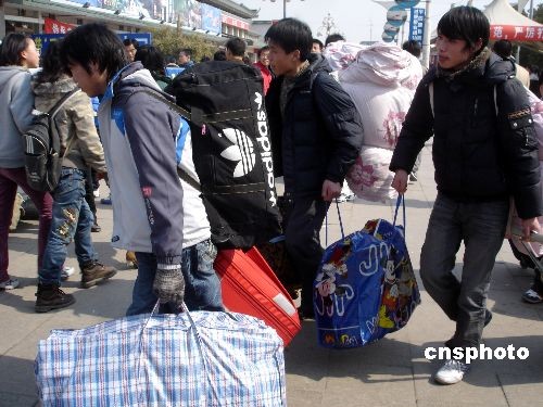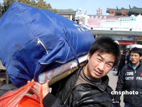 2月17日,返蘇民工扛著包裹從蘇州火車站走出。近日,外來務工人員返回蘇州呈現高峰,蘇州火車站客流量明顯上升。據悉,蘇州火車站平均日接收外來民工達3萬余人。中新社發 王建康 攝