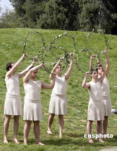 五名男祭司用橄欖枝編成的圓環(huán)組成了奧林匹克五環(huán)的形狀。
