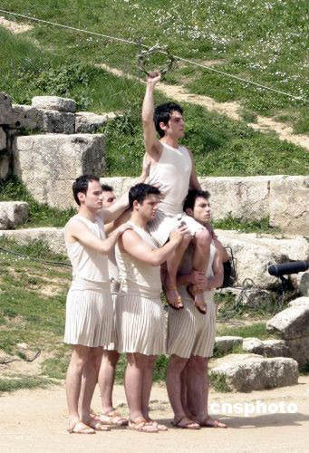 希臘當(dāng)?shù)貢r間3月24日,北京二00八年奧運會圣火采集儀式在古奧林匹亞競技場舉行,最高女祭司順利采集到火種,圖為采集儀式上五名男祭司表演。中新社發(fā) 王歡 攝