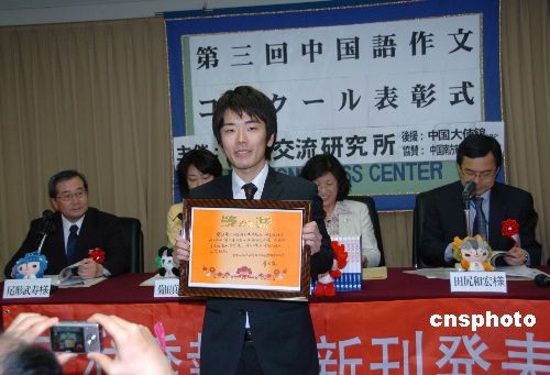 東京外國語大學三年級學生新保隆之從留學中國一年的體驗談北京奧運的作文受到高度評價,獲得中國駐日大使崔天凱簽名的最優秀獎。中新社發 段躍中 攝