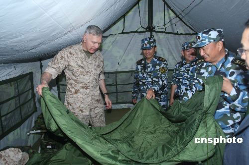 圖為美國海軍陸戰隊司令參觀中國海軍陸戰隊野戰睡具。中新社發 李唐 攝