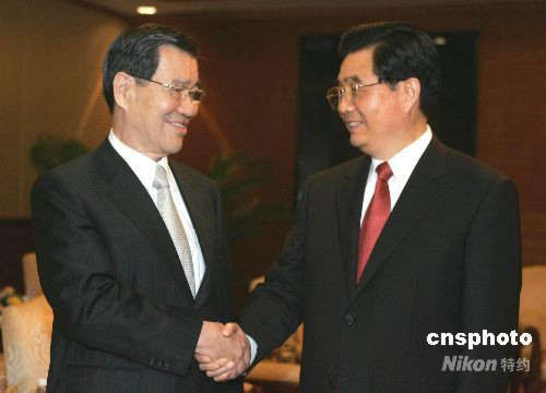 4月12日下午,中共中央總書記胡錦濤在海南省博鰲會見出席博鰲亞洲論壇2008年會的兩岸共同市場基金會董事長蕭萬長一行。中新社發(fā) 任晨鳴 攝