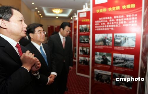 中國保監會副主席周延禮(中)與中國人保集團總裁、人保財險董事長吳焰(左),中國人保集團副總裁、人保財險總裁王毅共同觀看展示人保財險(PICC)在雨雪冰凍災害理賠工作的展板。中新社發 楊可佳 攝