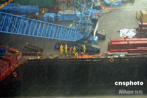 在會展中心擴建工地上施工人員冒雨工作。中新社發 洪少葵 攝