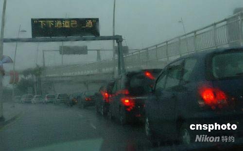 三條通往凼仔的大橋路面封閉,西灣大橋下層通道(封閉車道)開通,過橋車輛排成長龍。中新社發 史利 攝