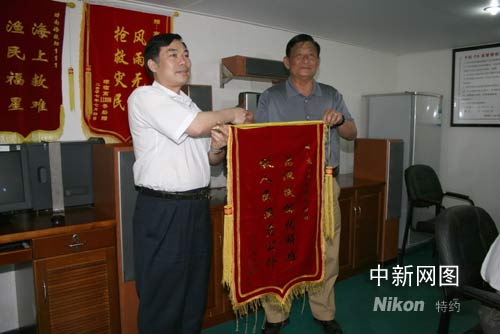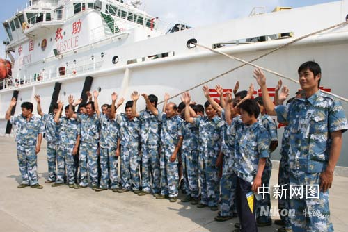 在碼頭上,獲救漁民換上了三亞救助基地送上的新衣服,興高采烈在救助船旁照相留念。周萬里 攝