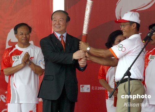 圖為北京奧組委執(zhí)行副主席蔣效愚(左二)向雅加達省政府贈送“祥云”火炬。 沈晨 攝
