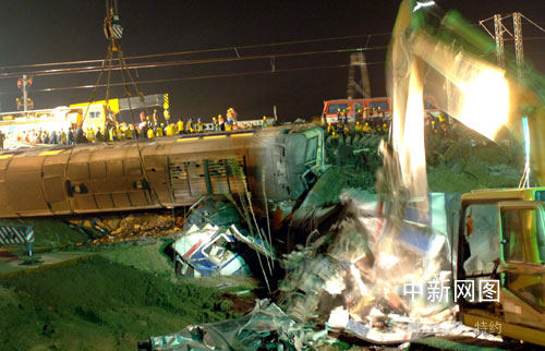 4月28日深夜,“4·28”膠濟(jì)鐵路事故現(xiàn)場加緊清理。當(dāng)?shù)罔F路部門、武警部隊(duì)等上萬名搶險(xiǎn)人員在將傷員和旅客轉(zhuǎn)移后,對鐵路軌道和供電線路進(jìn)行緊急搶修,并同時(shí)清理被撞毀列車車廂。鄒憲 攝