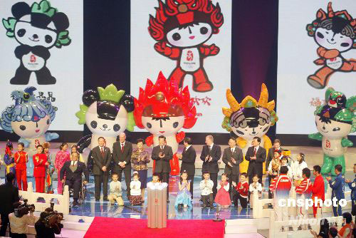 2005年11月11日晚,北京二零零八年奧運會吉祥物發布暨倒計時一千天活動在北京工人體育館舉行,五個吉祥物福娃貝貝、福娃晶晶、福娃歡歡、福娃迎迎、福娃妮妮隆重登場。作者:盛佳鵬