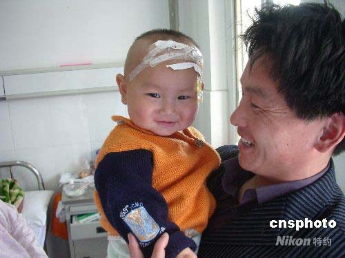 4月29日,阜陽(yáng)市第二人民醫(yī)院,家長(zhǎng)抱著已脫離生命危險(xiǎn)的患兒在病房?jī)?nèi)笑逐顏開。家住安徽省阜陽(yáng)市潁泉區(qū)蘇屯鄉(xiāng)孟寨大隊(duì)1歲患兒劉暢,4月17日因發(fā)熱伴手足皮疹入住該醫(yī)院,當(dāng)時(shí)病情很嚴(yán)重,經(jīng)醫(yī)院專家會(huì)診調(diào)整治療方案,目前病情穩(wěn)定。4月29日上午,安徽省衛(wèi)生廳副廳長(zhǎng)杜昌智在通報(bào)會(huì)上說,目前阜陽(yáng)共報(bào)告腸道病毒EV71感染病例1520例,其中痊愈585例,經(jīng)全力搶救無效死亡20例,仍在住院治療412例,其中重癥患者26例。中新社發(fā) 張婭子 攝