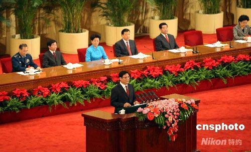 北京奧組委主席在奧運會倒計時100天誓師大會上致辭。中新社發 任海霞 攝