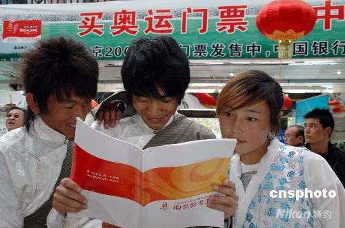 5月5日上午,北京奧運會第三階段門票開始在拉薩銷售,該銷售工作與全國同步進行。奧運會門票的銷售,引起了拉薩市民的極大熱情。在西藏奧運會門票銷售點的中國銀行西藏自治區分行里,購買奧運會門票的市民排起了長長的隊伍。圖為西藏大學的學生在看購票參考手冊。 中新社發 周波 攝