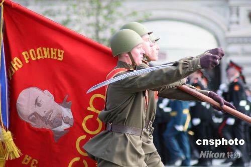 5月9日,俄羅斯在莫斯科紅場舉行盛大閱兵式,慶祝衛(wèi)國戰(zhàn)爭勝利63周年。俄羅斯總統(tǒng)梅德韋杰夫和總理普京等出席閱兵儀式。圖為身穿二戰(zhàn)時期蘇聯(lián)軍服的士兵接受檢閱。中新社發(fā) 田冰 攝