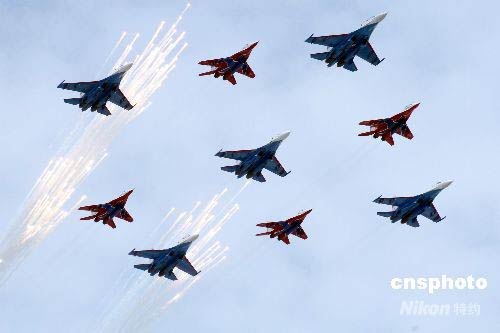 5月9日,俄羅斯在莫斯科紅場舉行盛大閱兵式,慶祝衛國戰爭勝利63周年,俄羅斯空軍“勇士”和“雨燕”飛行表演隊飛過紅場上空并發射禮花。中新社發 田冰 攝