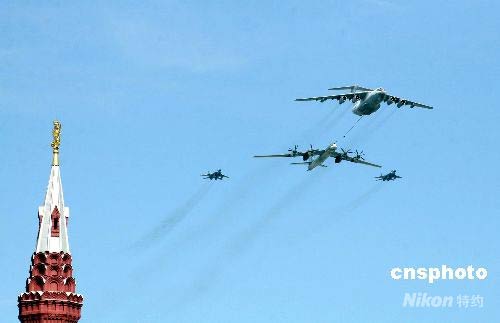 俄羅斯空軍伊爾-78、圖-95和米格-29戰(zhàn)機(jī)編隊(duì)飛過紅場上空。中新社發(fā) 田冰 攝