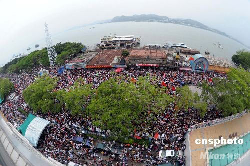 5月10日,圣火盆于16時18分在汕頭市人民廣場點燃,這標志著北京奧運圣火廣東省傳遞圓滿落幕。圖為當圣火在中國跳水隊汕頭集訓基地的露天跳水臺進行傳遞的時候,毗鄰汕頭灣的街道上人潮洶涌護擁圣火。 中新社發 廖攀 攝