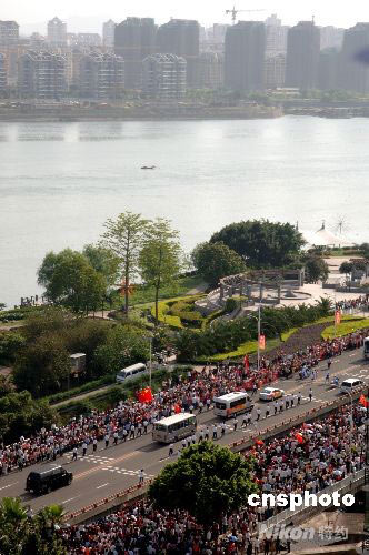 5月11日下午,北京奧運火炬在福州最美的江濱大道進行傳遞,現場盛況空前。 中新社發 王東明 攝