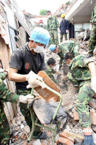 5月14日,成都軍區某特種大隊戰士在清理地震廢墟現場。