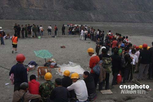 汶川縣映秀鎮等災區群眾經過幾天的跋涉,走到安全地帶等待運往災民安置點。中新社發 郭國權 攝