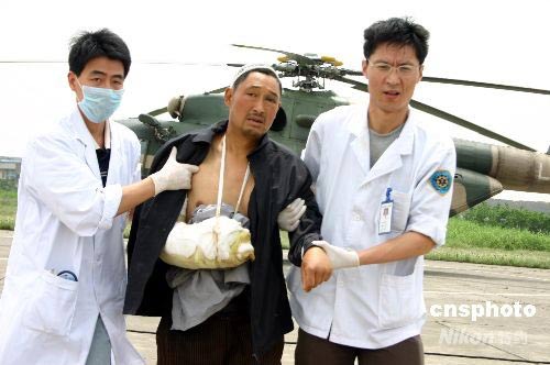 5月18日11時(shí)35分,一架軍用直升機(jī)載著11名臺(tái)灣游客,從四川汶川起飛,于12時(shí)許平安抵達(dá)成都鳳凰山機(jī)場(chǎng)。他們是臺(tái)灣祥鶴旅行社14人游客團(tuán)中脫困的首批游客,另3人將于下午搭乘另一架直升機(jī)脫離險(xiǎn)境。圖為救護(hù)人員攙扶臺(tái)灣游客上車。中新社發(fā) 楊杰 攝