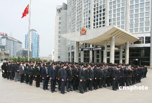 5月19日,中國外交部全體人員在外交部主樓外舉行莊重的默哀活動(dòng),表達(dá)對(duì)四川汶川大地震罹難同胞的深切哀悼。中新社發(fā) 廖文靜 攝