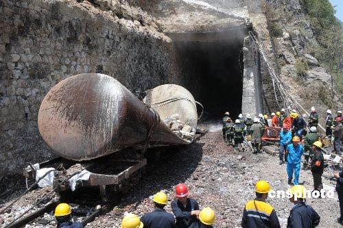 5月20日,寶成鐵路109號隧道搶險工作取得重大進展,隧道南口已拖出全部12節(jié)油罐車中的最后一節(jié)。截至當日下午15時,隧道南口已拖出14節(jié)受損車輛,其中包括全部12節(jié)油罐車,隧道北口拖出8節(jié)車輛。至此,109號隧道內僅剩下18輛車未拖出。中新社發(fā) 唐振江 攝