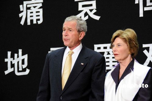 美國總統布什二十日一早來到中國駐美大使館,悼念中國四川大地震遇難者。圖為布什夫婦在周文重大使夫婦陪同下在中國大使館向地震遇難者默哀。中新社發 邱江波 攝