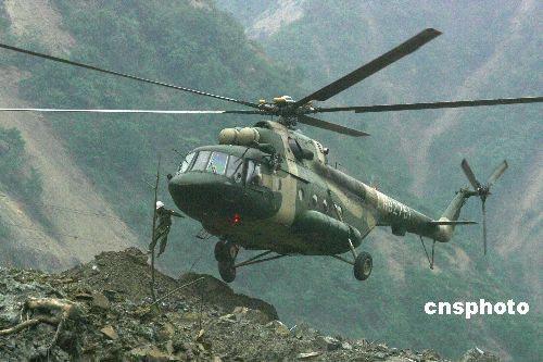 中國王牌直升機組單輪強降北川堰塞湖邊