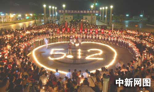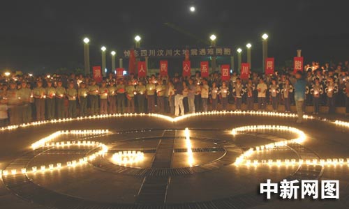 5月20日是全國哀悼日三天中的第二天,在浙江溫州市百島洞頭新城廣場上,洞頭縣消防大隊的官兵們點燃祭奠逝者的燭臺,擺放成含有5月12日標(biāo)志的心型,讓5月12日不幸遇難的同胞以及為了災(zāi)區(qū)安危舍身救人的消防官兵,為中國所銘記。哀傷的氣氛在廣場彌漫,廣場上的人們默默地守護著自己手中的燭光,低頭默哀,他們希望通過這種方式將地震遇難同胞通往天堂的路照亮,將受災(zāi)地區(qū)抗災(zāi)自救的路照亮。(江耘 林加佳 林加杰)