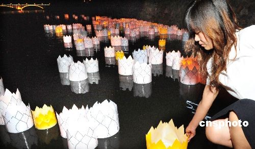 5月20日,全國哀悼日第二天,河南省洛陽市龍門石窟職工以及學生志愿者到盧舍那大佛前的伊河上放800余盞河燈,他們通過傳統的放河燈形式對四川地震遇難者寄予哀思。